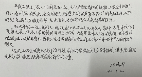 年夜饭桌上,家人们举杯共庆,谈论着国家的发展与变化,感恩党的领导和国家的繁荣昌盛。镜头下的每一道菜、每一句祝福,都承载着对家国的深情厚谊。