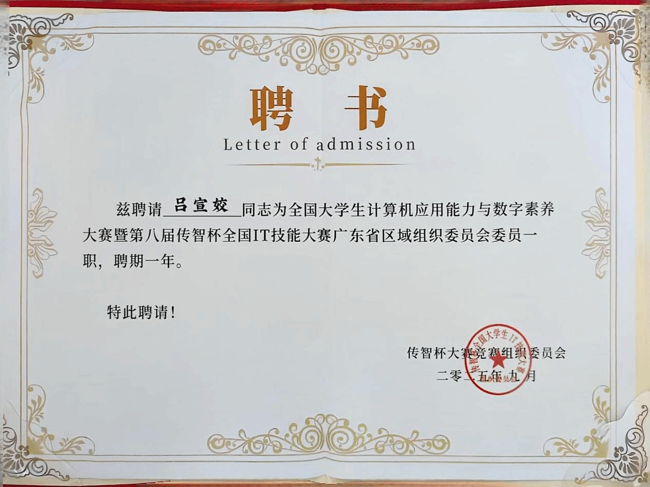 2025年9月20日,全国大学生计算机应用能力与数字素养大赛暨第八届传智杯全国IT技能大赛广东省赛事启动会在广州职业技术大学隆重举行。太阳集团官方网站被授予第七届赛事的“卓越示范赛点””称号,同时电气学院教师吕宣姣老师作为教师代表受聘为第八届广东省区域组织委员会委员。